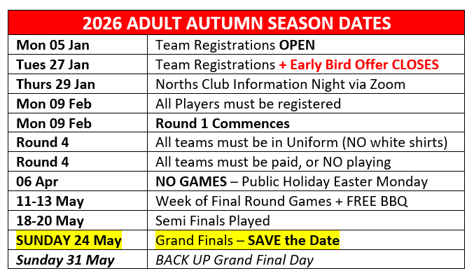 Home Welcome to NORTHS TOUCH Join us Fixtures and results Click for Club Info Duty Roster Autumn 2026 Kicks Off Monday 9 Feb Please ensure ALL players are registered by Sunday 8 Feb.View our updated Club Guide for full season details & follow our club FB for updates